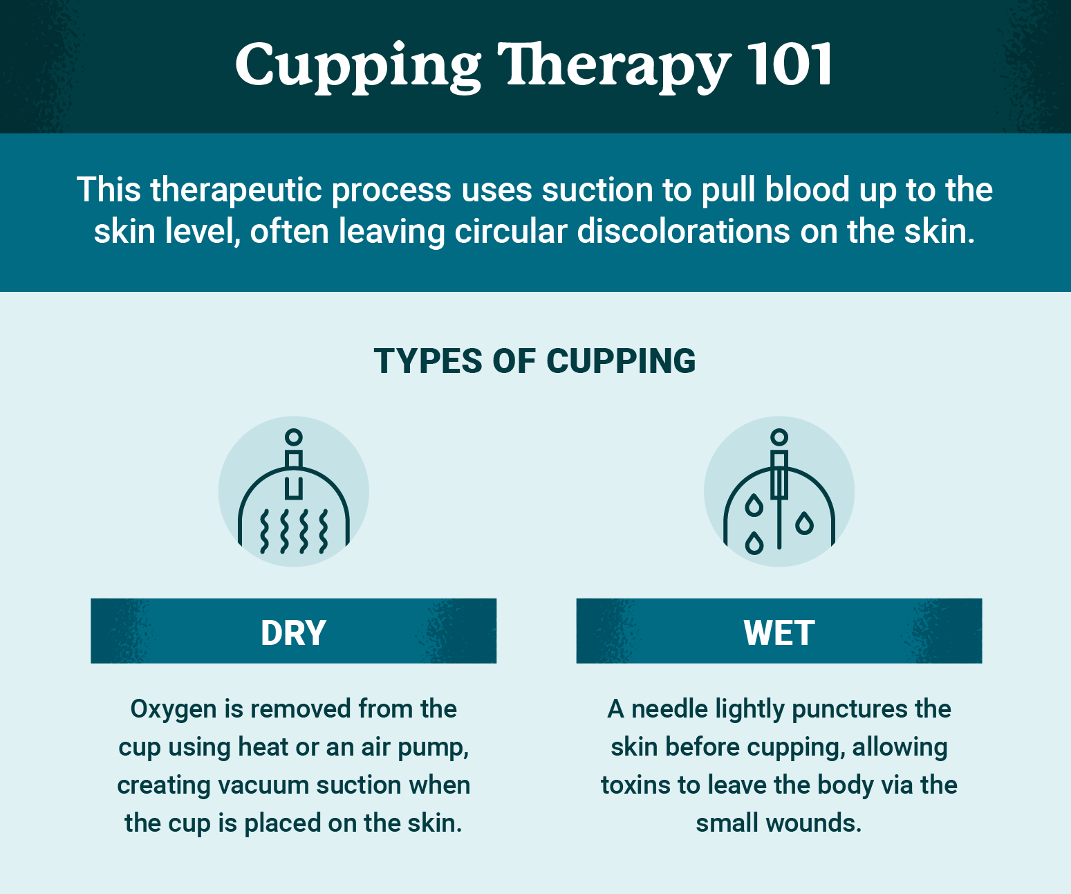 There are two main types of cupping: wet and dry. The practice of wet cupping involves lightly piercing the skin with a needle, allowing blood to flow into the cup. Dry cupping does not incorporate the skin piercings; thus, the skin remains dry.5