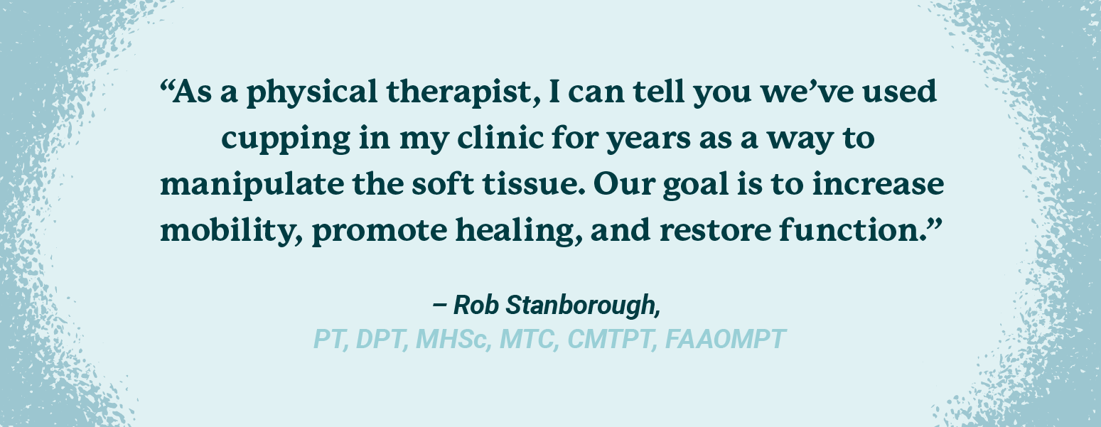 Physical therapist Rob Stanborough , PT, DPT, MHSc, MTC, CMPTP, FAAOMPT, a faculty member of the University of St. Augustine for Health Sciences (USAHS), has incorporated cupping into his treatments for years in an effort to manipulate his patients' soft tissue. He notes, " We use our hands and elbows but can also use instrument-assisted soft tissue manipulation, dry needling where permitted, cupping, and a variety of other methods, all to get those tissues moving. Our goal is to increase mobility, promote healing, and restore function."